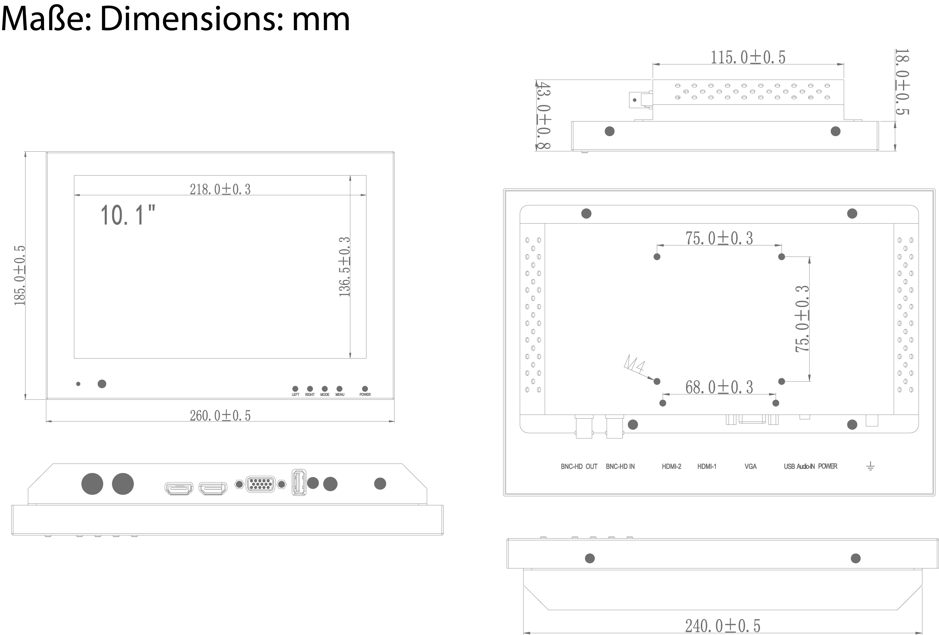 10" (25cm) LCD Monitor, metall, FHD, 1920x1080, LED, HDMI, VGA, Composite
