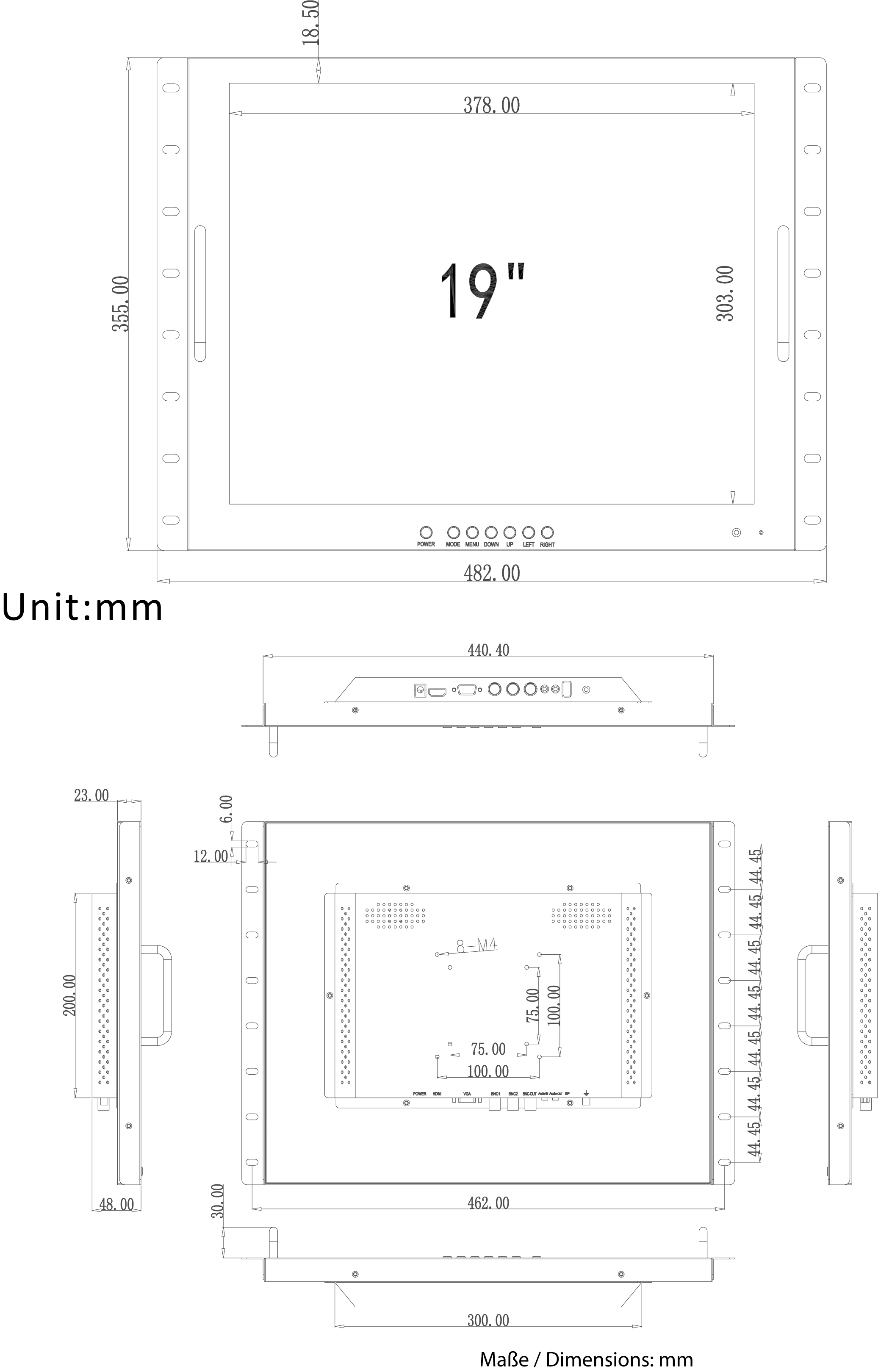 19" (48cm) LCD Monitor, Industrie, metall, HD, 1280x1024, Schutzglas, Rack Mount, 12V, HDMI, VGA
