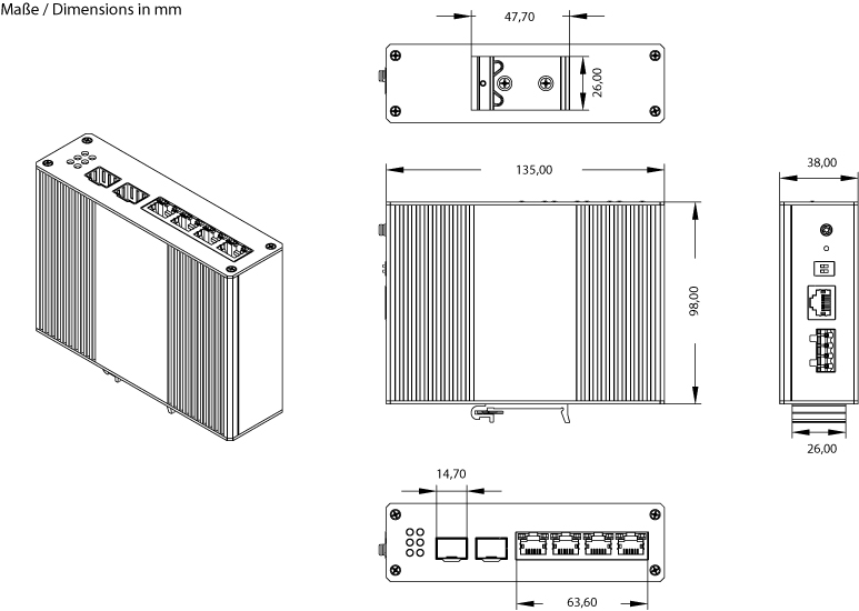 - Robust IP30 housing, DIN-RAIL or wall mounting