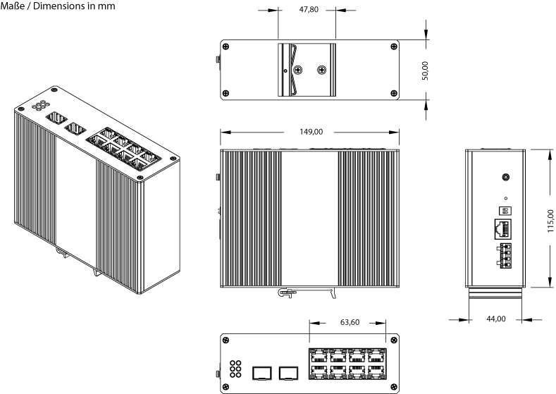 - Robust IP30 housing, DIN-RAIL or wall mounting