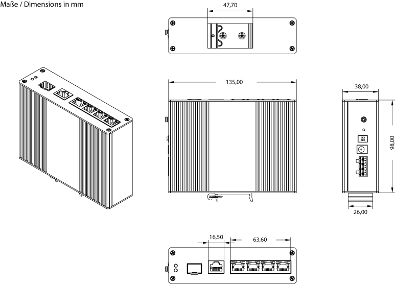 - Robust IP30 housing, DIN-RAIL or wall mounting