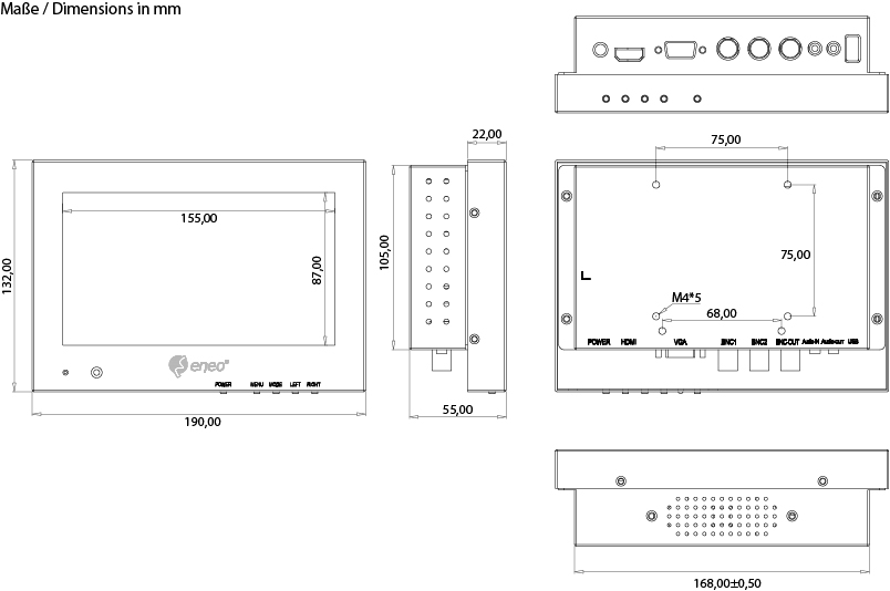 7" (17,7cm) LCD Monitor 800x480, LED, HDMI, VGA, Composite