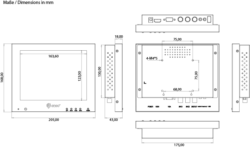 8" (20,3cm) LCD Monitor SD, 1024x768, LED, HDMI, VGA, Composite